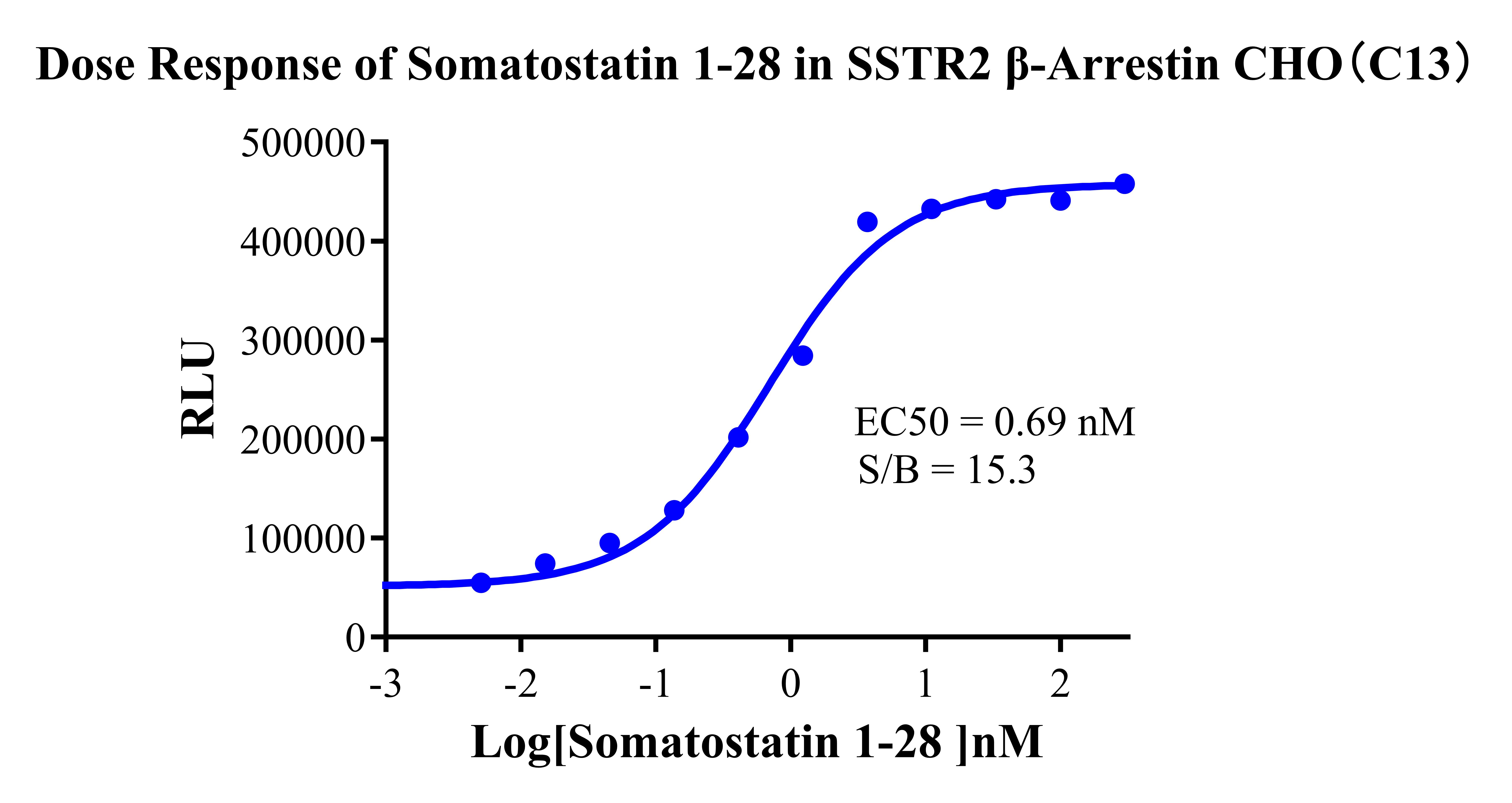 SSTR2 β-Arrestin CHO 報(bào)告基因藥靶模型很好的模擬了體內(nèi) SSTR2/β-Arrestin 的信號 轉(zhuǎn)導(dǎo)過程,原理見下圖所示。當(dāng)缺乏配體刺激時,β-Arrestin 不與 SSTR2 結(jié)合,融合β- Arrestin 的熒光素酶處于失活構(gòu)象,當(dāng) SSTR2 遭遇配體刺激時,融合熒光素酶報(bào)告基因的 β-Arrestin 被招募,使熒光素酶報(bào)告基因處于激活狀態(tài),加入其底物后發(fā)光信號增強(qiáng)。