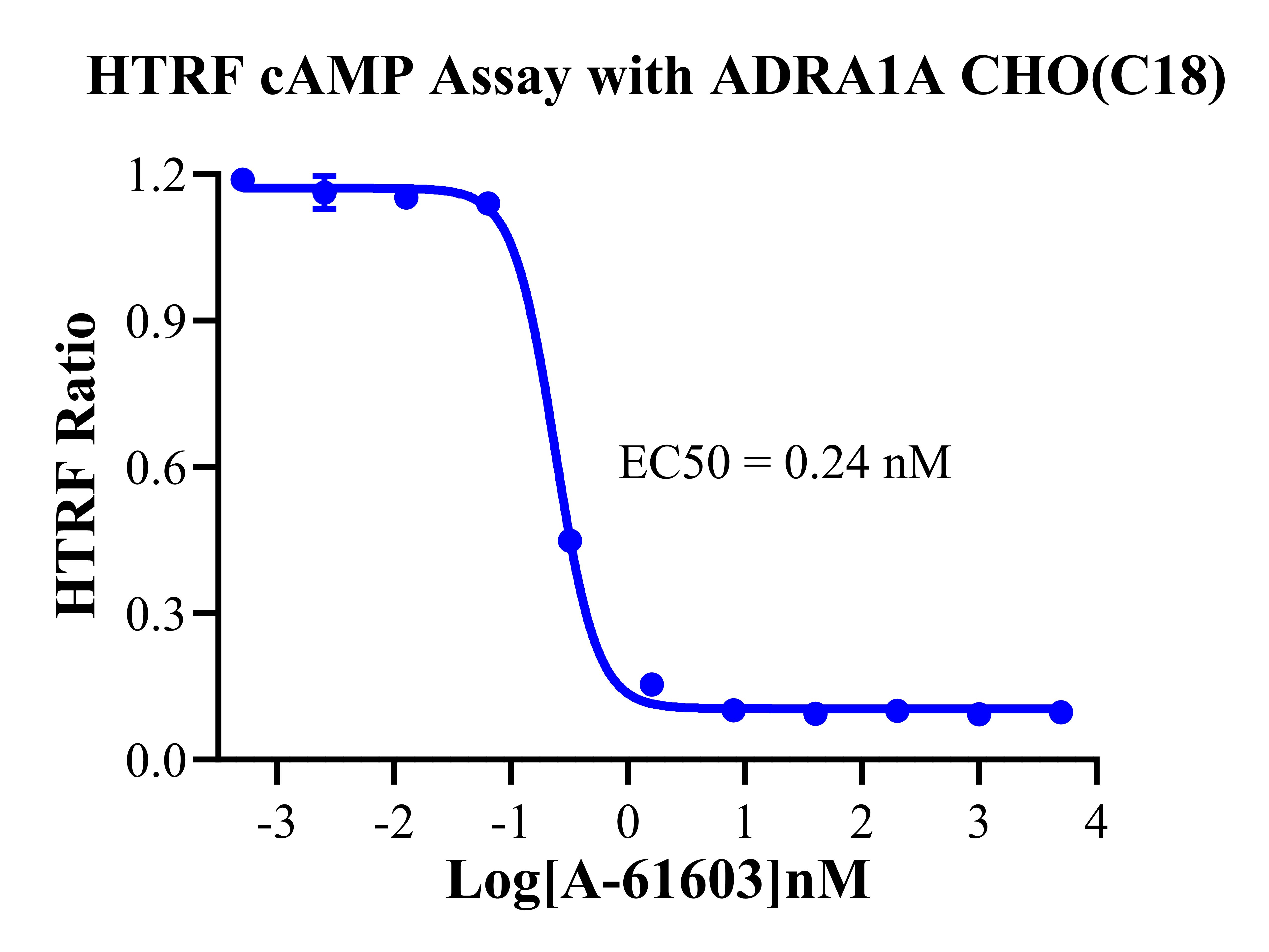 ADRA1A 還可以通過 Gq 蛋白的信號通路,調(diào)控 IP1 的升高。ADRA1A 與配體結(jié)合, 導(dǎo)致 Gαq 亞基的激活,觸發(fā) PLC-γ,從而產(chǎn)生兩個第二信使:IP3 和 DAG,它們參與細(xì)胞內(nèi)鈣動員。由于 IP3 在代謝上不穩(wěn)定,因此測量通路激活的替代標(biāo)志物 IP1 作為檢測標(biāo)準(zhǔn)。