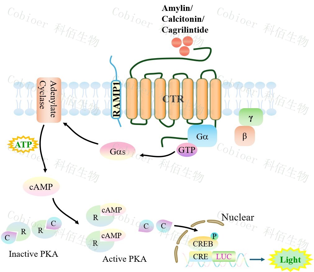 CTR&RAMP1 CRE-Luc CHO 報告基因藥靶模型很好的模擬了體內 CTR&RAMP1 的信號轉導過程,原理見下圖所示。