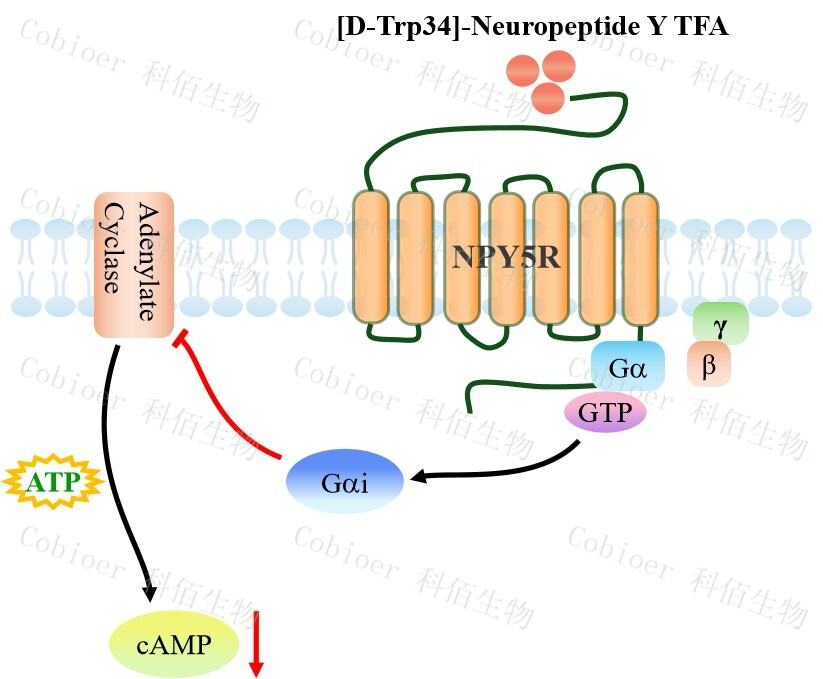 神經(jīng)肽 Y(NPY)作為一種重要的神經(jīng)遞質(zhì),廣泛分布于脊椎動(dòng)物的中樞神經(jīng)系統(tǒng)和 周圍神經(jīng)系統(tǒng)。通過(guò)與不同的亞型受體結(jié)合,NPY 激活信號(hào)轉(zhuǎn)導(dǎo)通路,從而調(diào)節(jié)攝食 、能 量平衡、焦慮、晝夜節(jié)律和其他生理過(guò)程。NPY 受體(NPYR)屬于 G 蛋白偶聯(lián)受體家族, 目前在哺乳動(dòng)物中已鑒定出 5 種受體基因亞型,即 NPY1R、NPY2R、NPY4R、NPY5R 和 NPY6R。 NPY5R 主要響應(yīng)內(nèi)源性配體神經(jīng)肽 Y(NPY)、肽 YY(PYY)及胰腺多肽(PP), 通過(guò)偶聯(lián) Gi/o 蛋白抑制腺苷酸環(huán)化酶活性、降低細(xì)胞內(nèi) cAMP 水平,同時(shí)激活 MAPK/ ERK 通路并動(dòng)員鈣離子信號(hào),在下丘腦攝食中樞、情緒調(diào)節(jié)環(huán)路及能量代謝網(wǎng)絡(luò)中發(fā)揮核 心作用,其異?;罨c肥胖、糖尿病及情緒障礙密切相關(guān)。 |