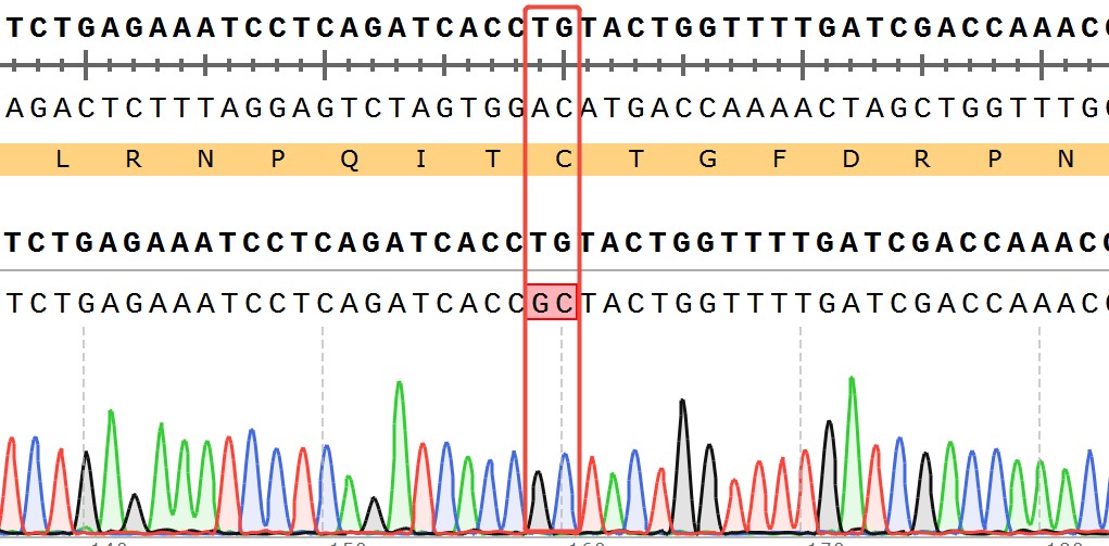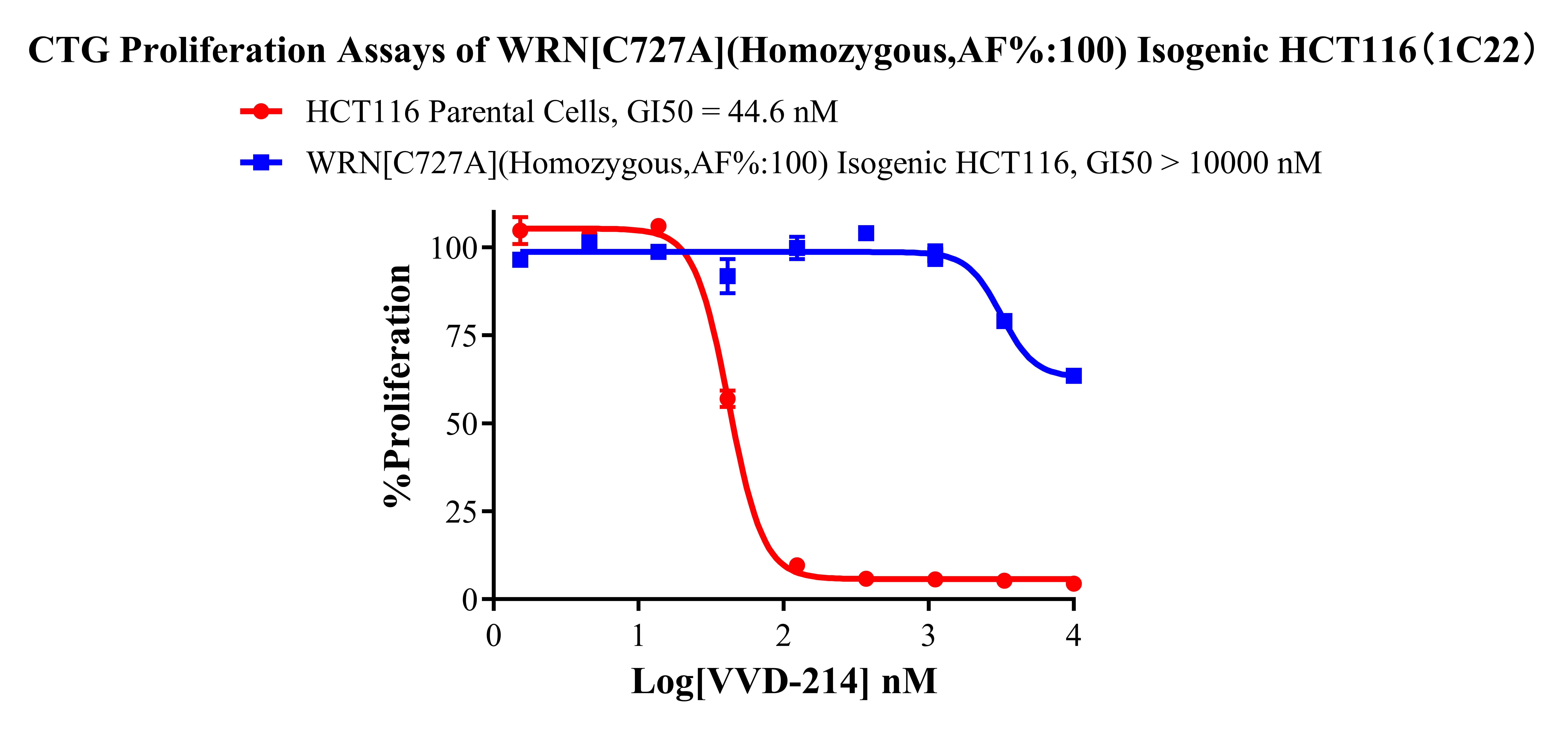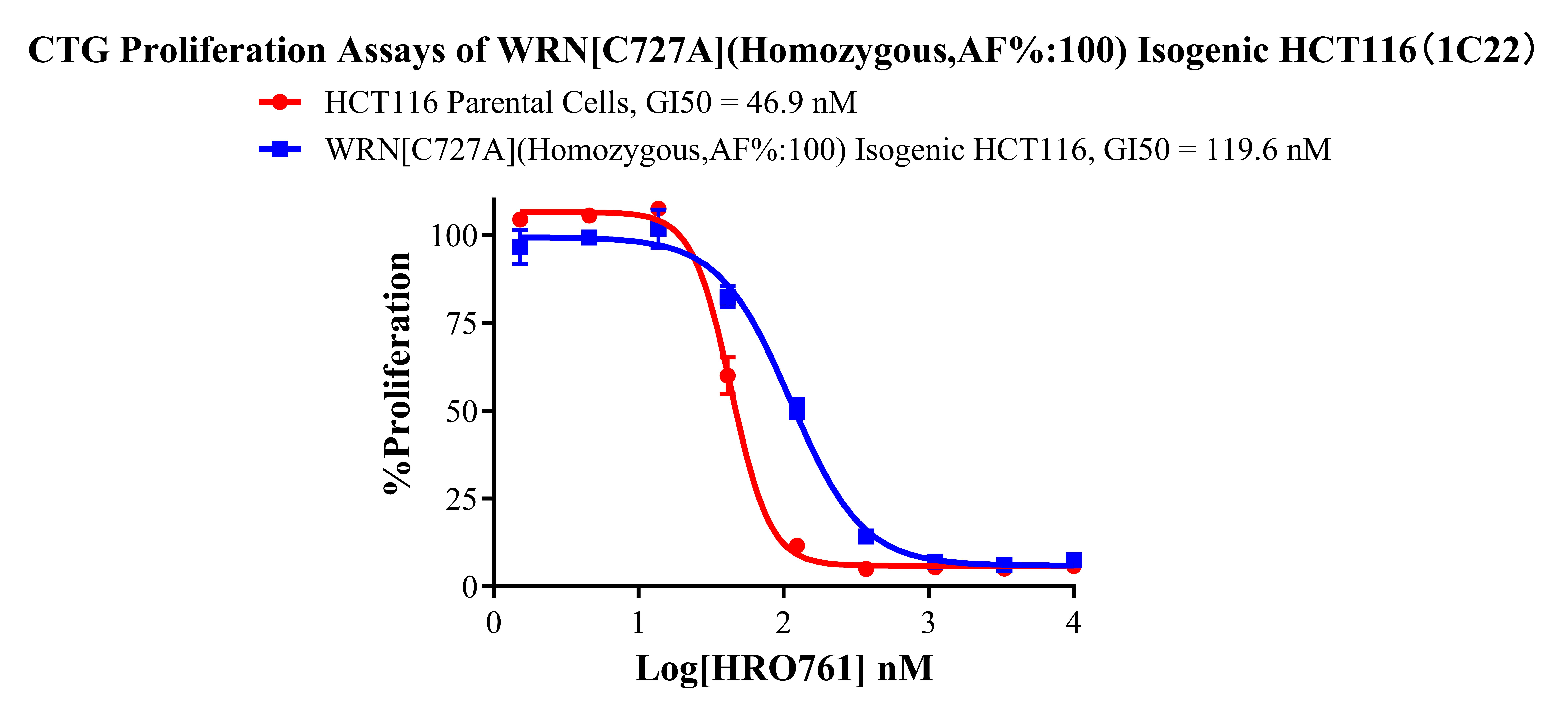 ![]() Figure 1. Sanger of WRN[C727A](Homozygous,AF%:100) Isogenic HCT116 ![]() Figure 2. A:HCT116 Parental Cell;B:WRN[C727A](Homozygous,AF%:100) Isogenic HCT116 通道2 藍(lán)色微滴代表WRN[C727A]突變陽(yáng)性,通道2 綠色微滴代表該位點(diǎn)為陰性野生型 ![]() Figure 3. CTG Proliferation Assays of WRN[C727A](Homozygous,AF%:100) Isogenic HCT116(1C22). ![]() Figure 4. CTG Proliferation Assays of WRN[C727A](Homozygous,AF%:100) Isogenic HCT116(1C22). |