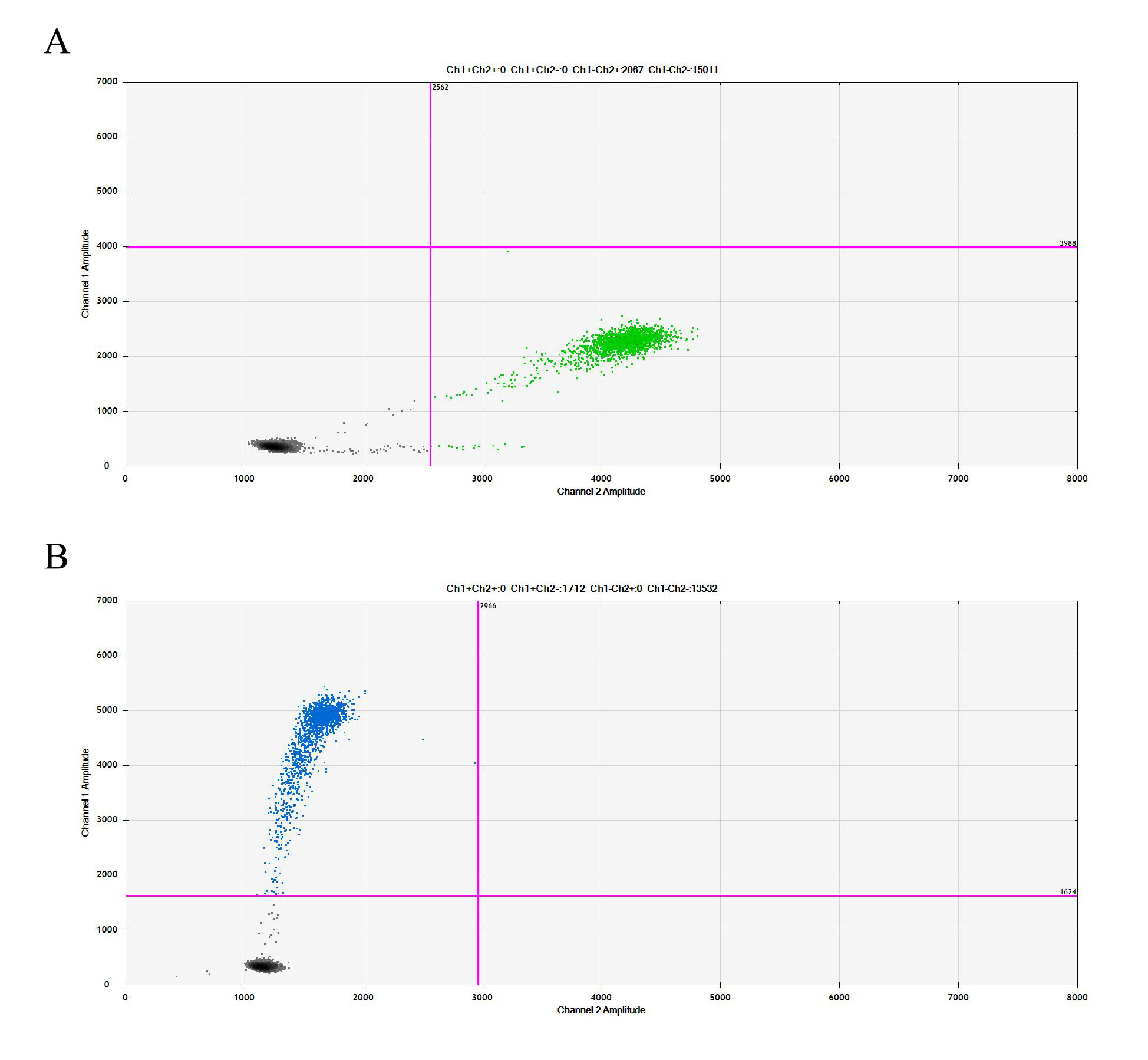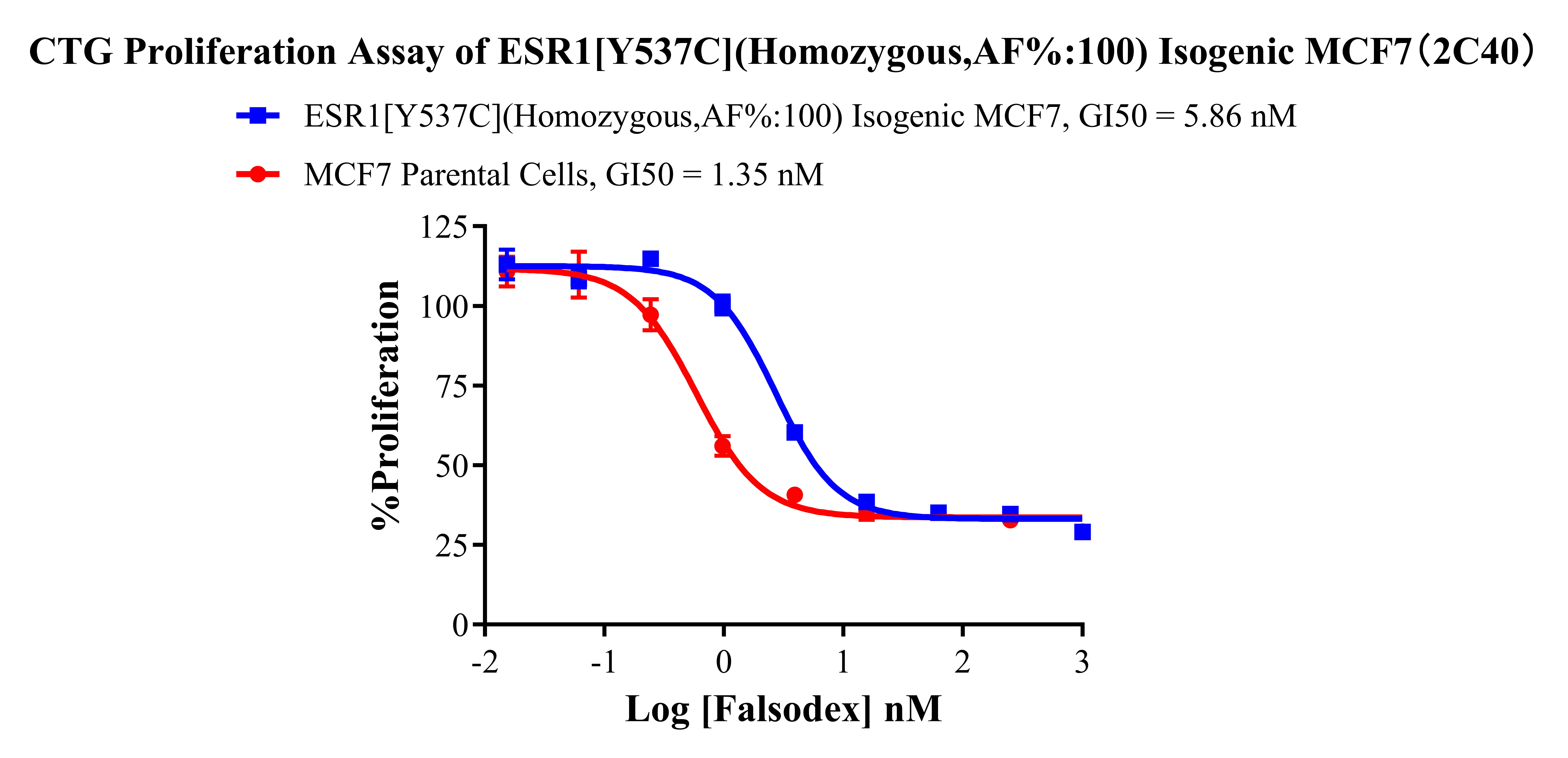 ![]() Figure 2. Sanger of ESR1[Y537C](Homozygous,AF%:100) Isogenic MCF7. ![]() Figure 3. A: MCF7 Parental Cell;B:ESR1[Y537C](Homozygous,AF%:100) Isogenic MCF7 通道2 藍(lán)色微滴代表ESR1[Y537C]突變陽(yáng)性,通道2 綠色微滴代表該位點(diǎn)為陰性野生型 ![]() Figure 4. CTG Proliferation Assay of ESR1[Y537C](Homozygous,AF%:100) lsogenic MCF7(2C40). |