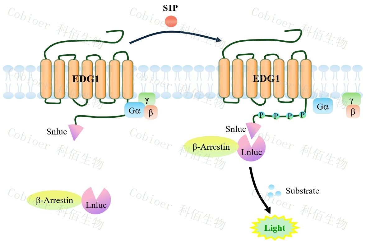 EDG1(S1P1) β-Arrestin CHO 報告基因藥靶模型很好的模擬了體內(nèi) EDG1(S1P1)/β- Arrestin 的信號轉(zhuǎn)導(dǎo)過程,原理見下圖所 示 。 當(dāng)缺乏配體刺激時, β-Arrestin 不 與 EDG1(S1P1)結(jié)合,融合β-Arrestin 的熒光素酶處于失活構(gòu)象,當(dāng) EDG1(S1P1)遭遇配體刺激 時,融合熒光素酶報告基因的β-Arrestin 被招募,使熒光素酶報告基因處于激活狀態(tài),加入 其底物后發(fā)光信號增強。![]() Figure 1. EDG1(S1P1) β-Arrestin CHO 細胞模型原理圖 |