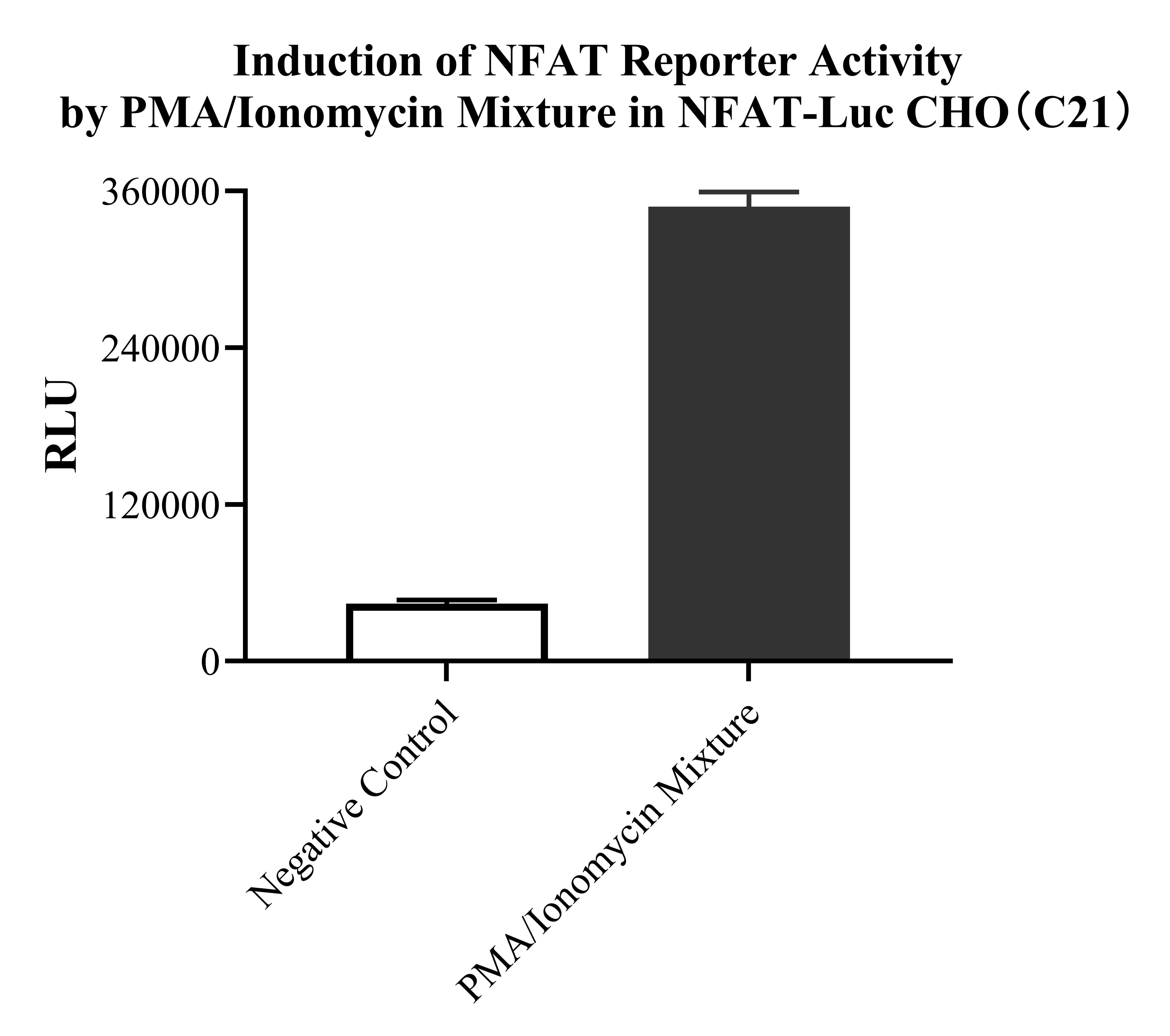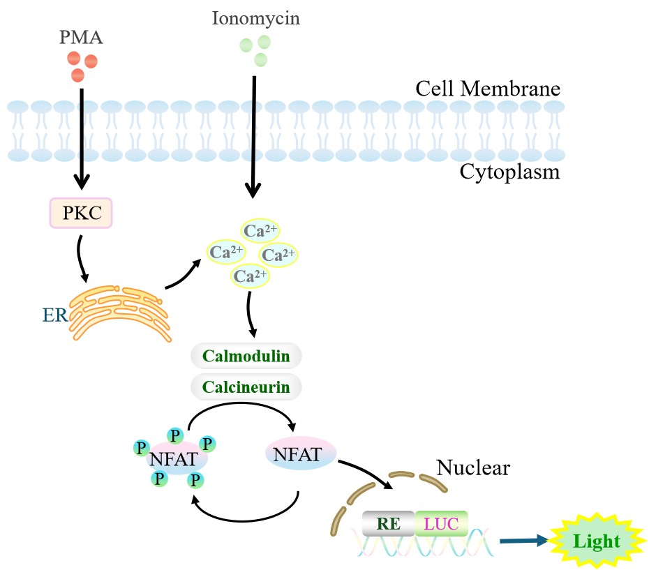 NFAT-Luc CHO 報告基因藥靶模型很好的模擬了體內(nèi) NFAT 的信號轉導過程,原理見下圖所示。