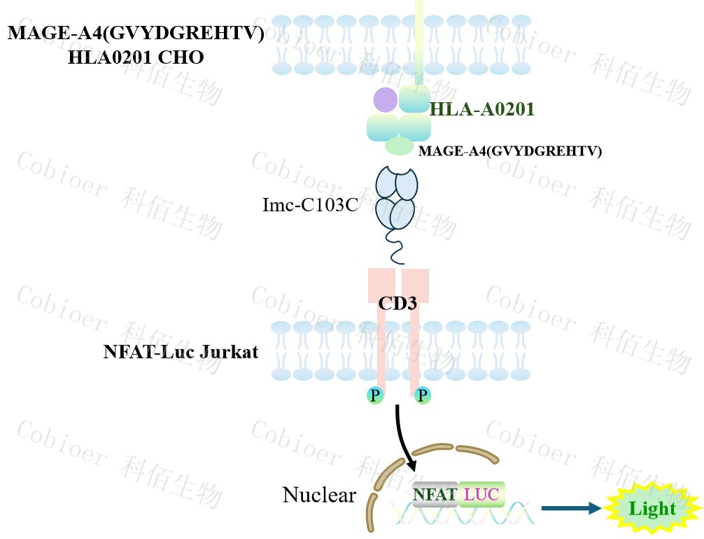 HLA-A*0201-MAGEA4 復合物是人類白細胞抗原(HLA)Ⅰ類分子與 MAGEA4 抗原肽的復合體,屬于主要組織相容性復合體(MHC)Ⅰ類家族成員。該復合物常用于 T 細胞 受體(TCR)療法,通過激活 T 細胞以識別并殺傷腫瘤細胞,原理見下圖所示。![]() Figure 1. MAGE-A4(GVYDGREHTV) HLA0201 CHO 細胞模型圖 |