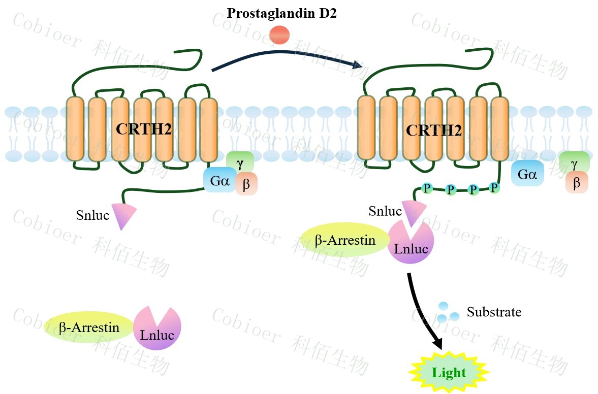 CRTH2(DP2) β-Arrestin CHO 報(bào)告基因藥靶模型很好的模擬了體內(nèi) CRTH2(DP2)/β- Arrestin 的信號(hào)轉(zhuǎn)導(dǎo)過(guò)程, 原理見(jiàn)下圖所示。 當(dāng)缺乏配體刺激時(shí) , β-Arrestin 不與 CRTH2(DP2)結(jié)合,融合β-Arrestin 的熒光素酶處于失活構(gòu)象,當(dāng) CRTH2(DP2)遭遇配體刺 激時(shí),融合熒光素酶報(bào)告基因的β-Arrestin 被招募,使熒光素酶報(bào)告基因處于激活狀態(tài),加 入其底物后發(fā)光信號(hào)增強(qiáng)。![]() Figure 1. CRTH2(DP2) β-Arrestin CHO 細(xì)胞模型原理圖 |