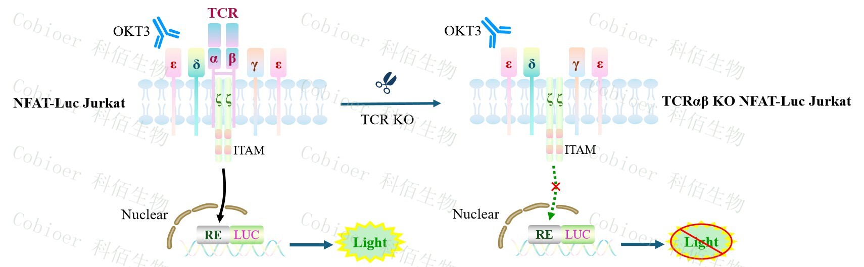 TCRαβ KO NFAT-Luc Jurkat 報告基因藥靶模型很好的模擬了體內(nèi) TCR 的信號轉導過程, 原理見下圖所示。![]() Figure 1. TCRαβ KO NFAT-Luc Jurkat 細胞模型原理圖 |