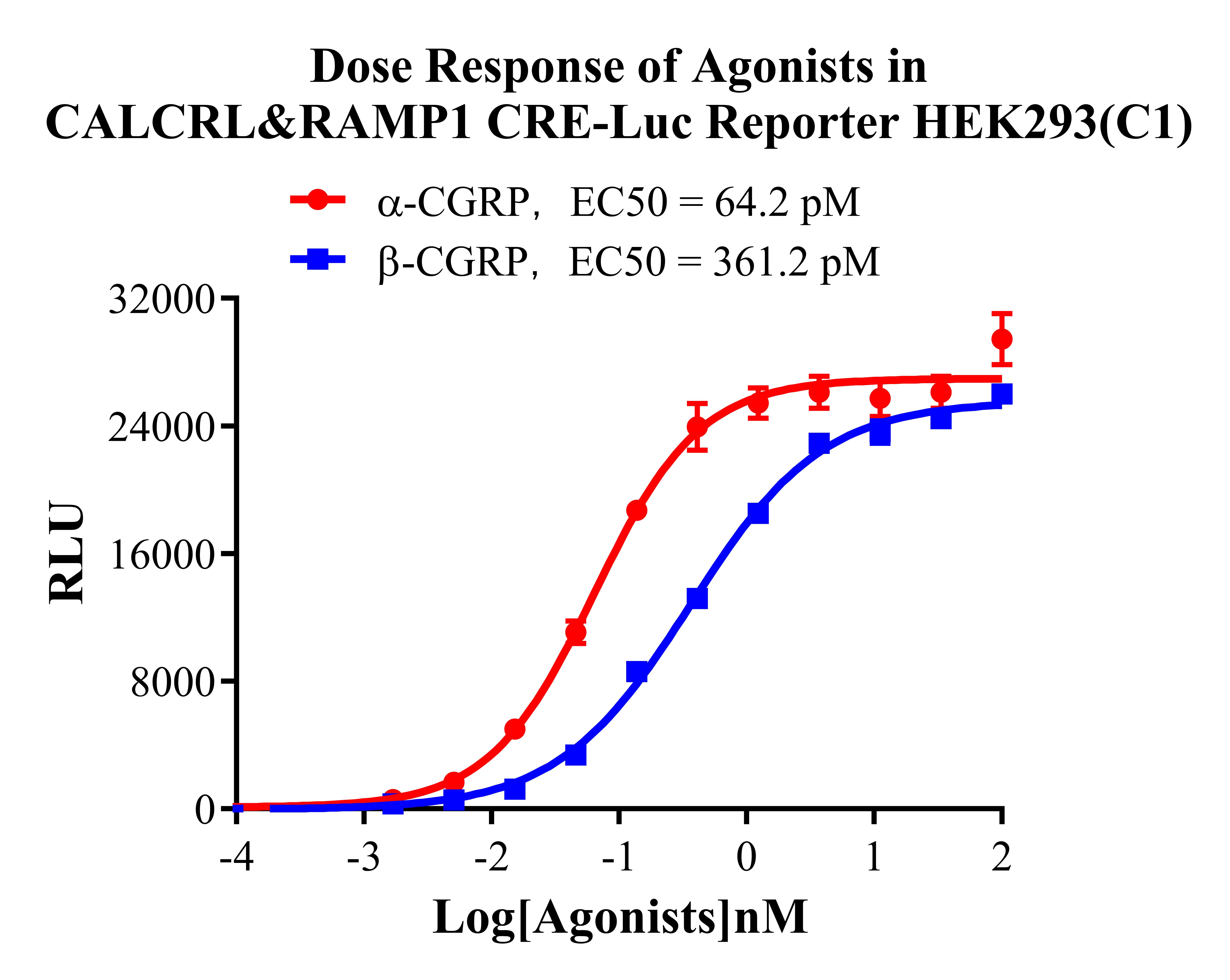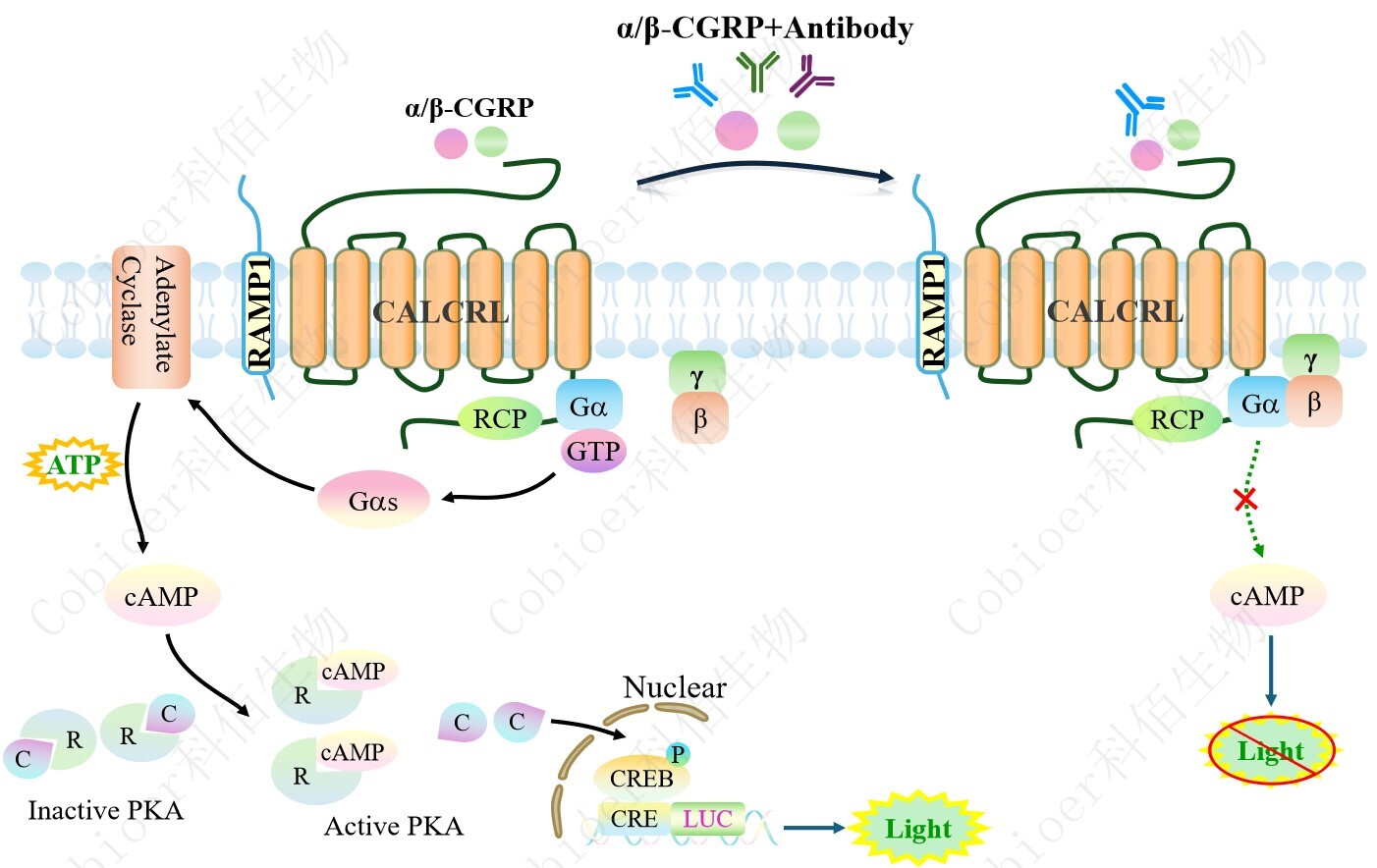 CALCRL&RAMP1 CRE-Luc HEK293 報(bào)告基因藥靶模型很好的模擬了體內(nèi) CGRP 的信 號(hào)轉(zhuǎn)導(dǎo)過(guò)程,原理見(jiàn)下圖所示。