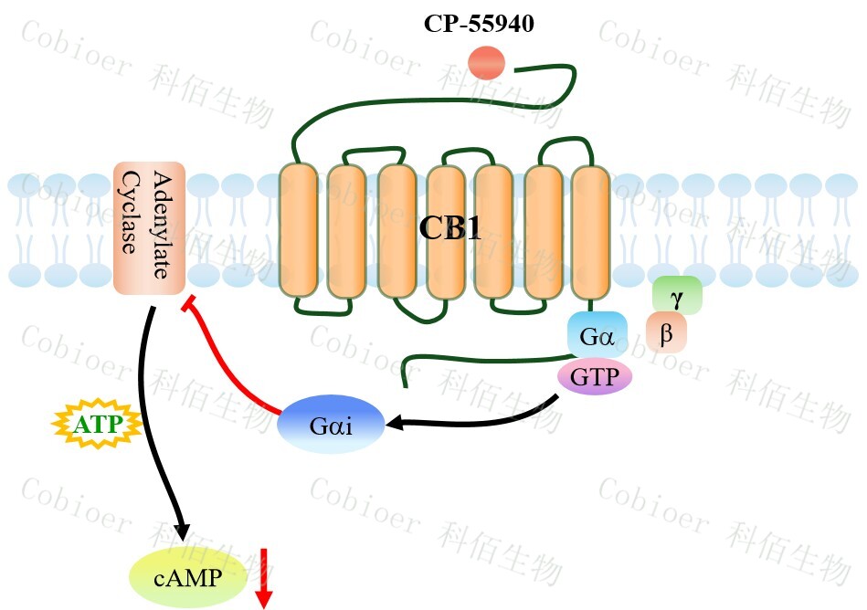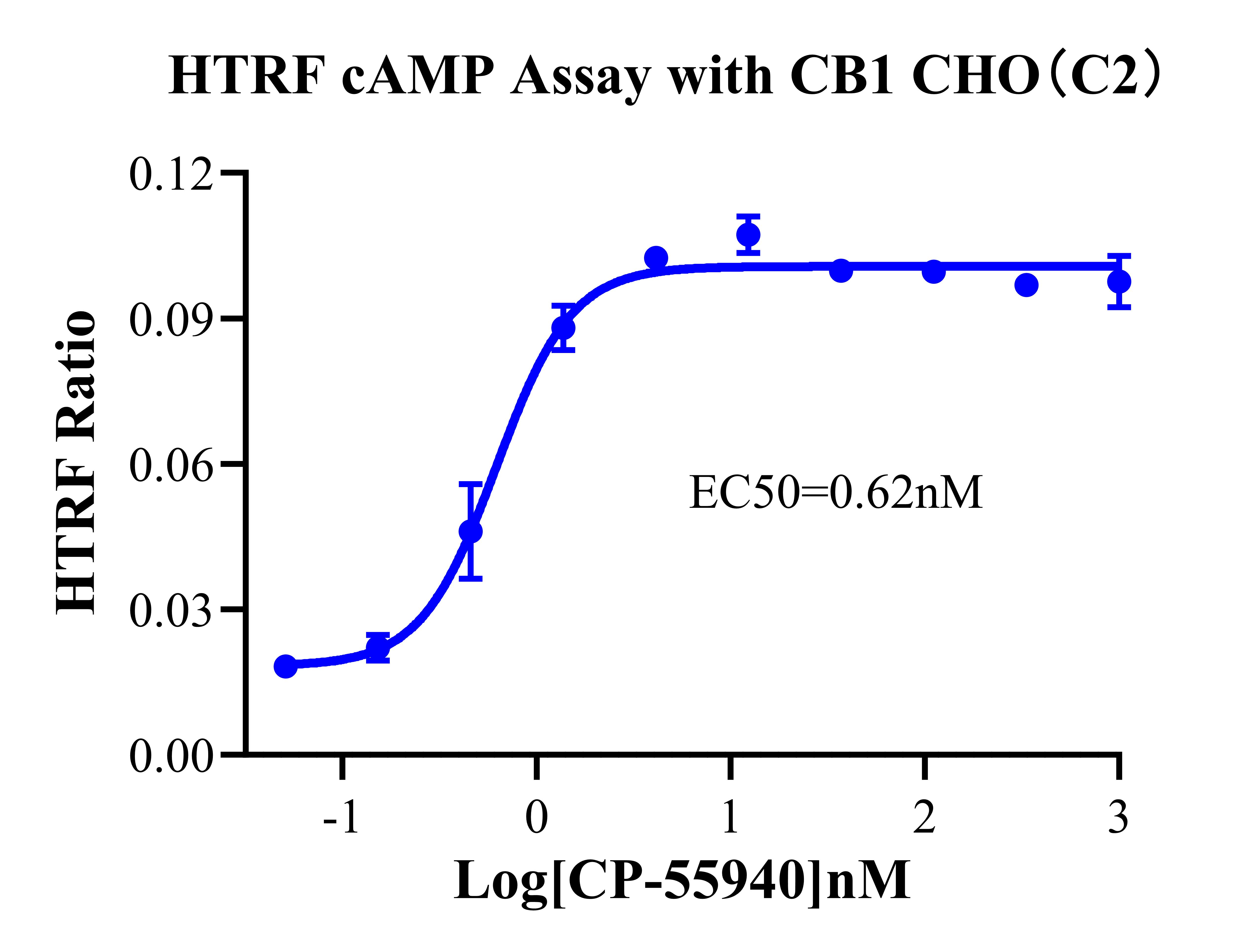 cAMP 在 G 蛋白偶聯(lián)受體(GPCR)信號轉(zhuǎn)導(dǎo)中是一種關(guān)鍵的第二信使。當(dāng)配體結(jié)合到 GPCR,構(gòu)象發(fā)生變化,激活受體接著激活 G 蛋白,Gi 的激活導(dǎo)致腺苷酸環(huán)化酶調(diào)控 cAMP 的下調(diào)。CB1 CHO 藥靶模型很好的模擬了體內(nèi) CB1 的信號轉(zhuǎn)導(dǎo)過程,原理見下圖所示。![]() Figure 1. CB1 CHO 細(xì)胞模型原理圖