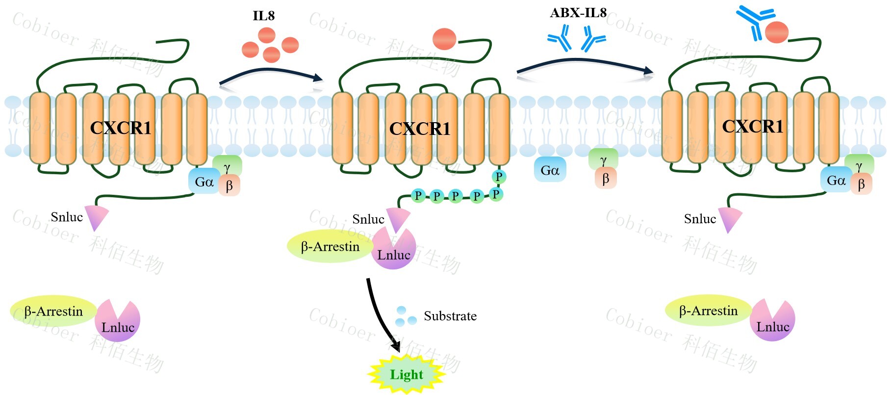 CXCR1 β-Arrestin CHO 報(bào)告基因藥靶模型很好的模擬了體內(nèi) CXCR1/β-Arrestin 的信號(hào)轉(zhuǎn)導(dǎo)過(guò)程,原理見(jiàn)下圖所示。當(dāng)缺乏配體刺激時(shí),β-Arrestin 不與 CXCR1 結(jié)合,融合β- Arrestin 的熒光素酶處于失活構(gòu)象,當(dāng) CXCR1 遭遇配體刺激時(shí),融合熒光素酶報(bào)告基因的 β-Arrestin 被招募,使熒光素酶報(bào)告基因處于激活狀態(tài),加入其底物后發(fā)光信號(hào)增強(qiáng)。![]() Figure 1. CXCR1 β-Arrestin CHO 細(xì)胞模型原理圖 |