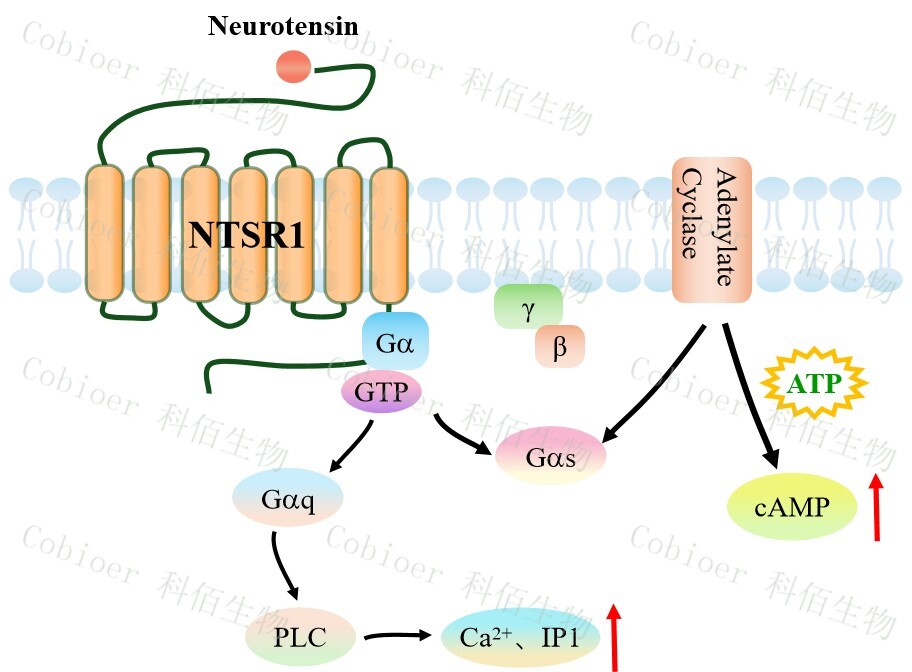 | cAMP 在 G 蛋白偶聯(lián)受體(GPCR)信號(hào)轉(zhuǎn)導(dǎo)中是一種關(guān)鍵的第二信使。當(dāng)配體結(jié)合 到 GPCR,構(gòu)象發(fā)生變化,激活受體接著激活 G 蛋白,Gs 的激活導(dǎo)致腺苷酸環(huán)化酶調(diào)控 cAMP 的升高。 NTSR1 還可以通過(guò) Gq 蛋白的信號(hào)通路,調(diào)控 IP1 的升高。NTSR1 與配體結(jié)合,導(dǎo)致 Gαq 亞基的激活,觸發(fā) PLC-γ,從而產(chǎn)生兩個(gè)第二信使:IP3 和 DAG,它們參與細(xì)胞內(nèi)鈣 動(dòng)員。由于 IP3 在代謝上不穩(wěn)定,因此測(cè)量通路激活的替代標(biāo)志物 IP1 作為檢測(cè)標(biāo)準(zhǔn)。 NTSR1 CHO 細(xì)胞藥靶模型很好的模擬了體內(nèi) NTSR1 的信號(hào)轉(zhuǎn)導(dǎo)過(guò)程,原理見(jiàn)下圖所示。 ![]() Figure 1. NTSR1 CHO 細(xì)胞模型原理圖 |