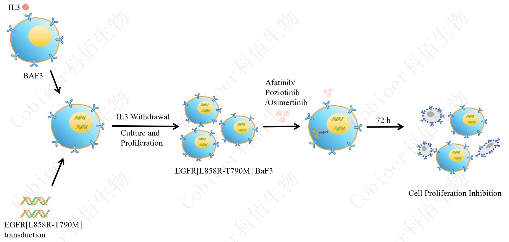 BaF3(小鼠原 B 細胞)的生長和增殖需要 IL-3 的維持。通過引入各種表達激酶的基因, 能作為 BaF3 的驅動基因,讓 BaF3 不再依賴 IL-3 而增殖,進而激酶基因成為 BaF3 增殖依 賴的驅動基因,用于評估小分子藥物對激酶的靶向抑制作用,原理及流程見下圖所示。