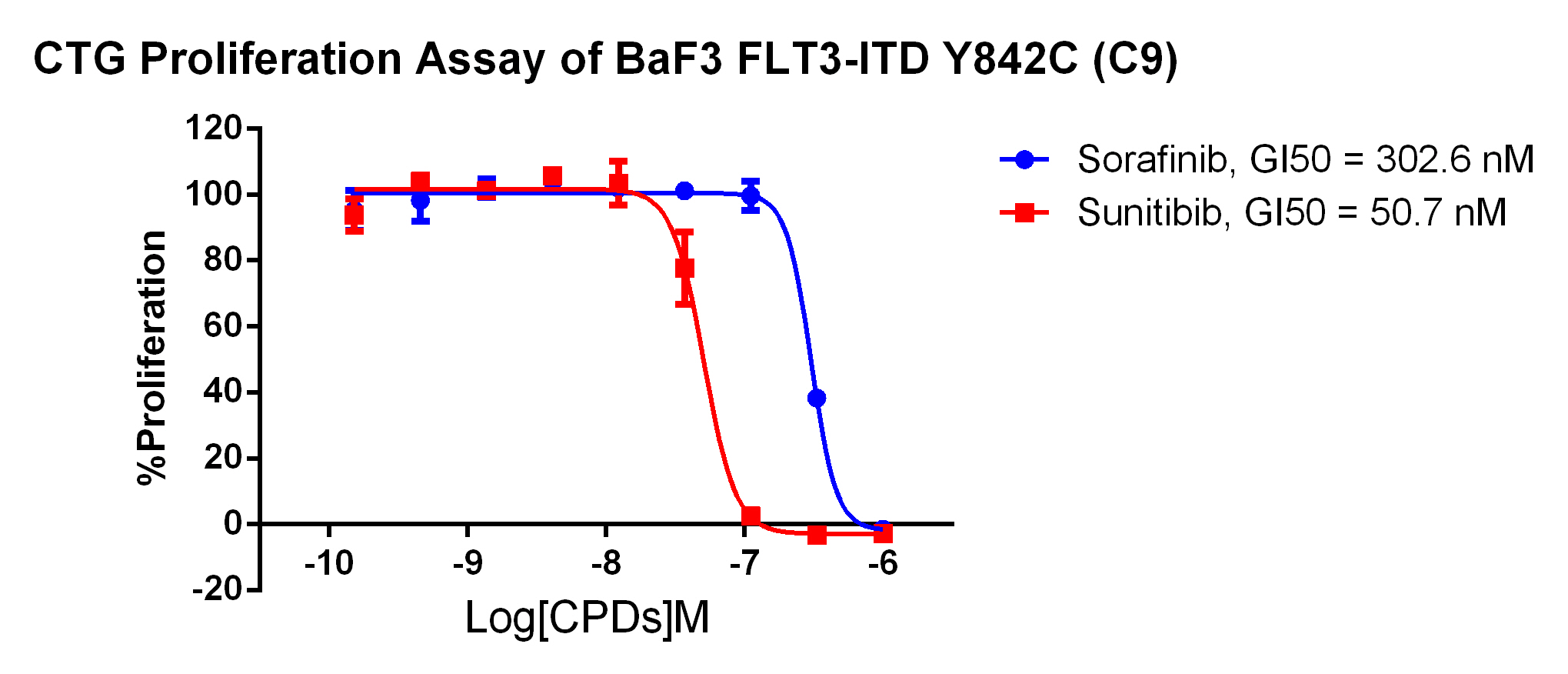 Figure 2. Anti-proliferation assay of two reference compounds on the FLT3-ITD [Y842C]/BaF3 Stable Cell Line. |
