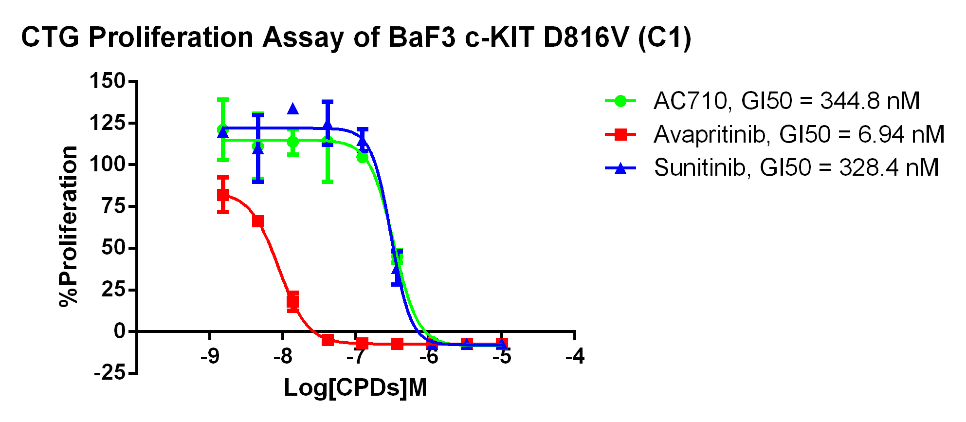 Figure 3. Anti-proliferation assay of three reference compounds on the c-Kit D816V/BaF3. |