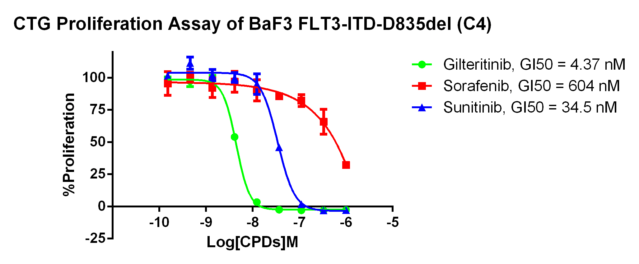 Figure . Anti-proliferation assay of three reference compounds on the FLT3-ITD [D835del]/BaF3 Stable Cell Line.