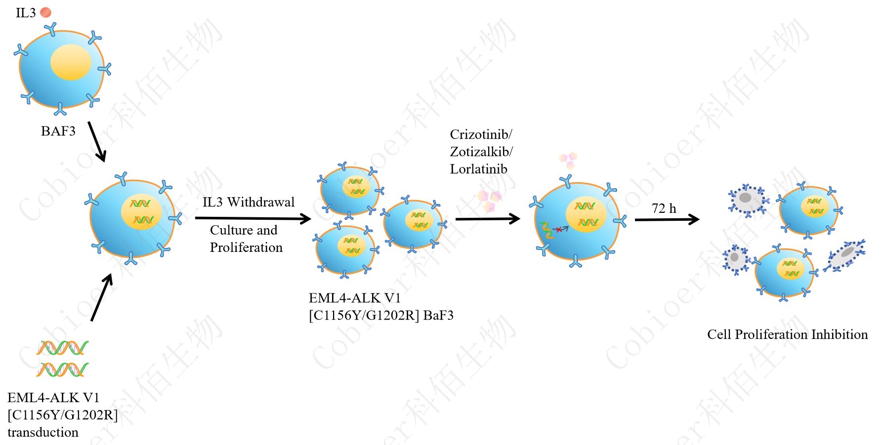 BaF3(小鼠原 B 細胞)的生長和增殖需要 IL-3 的維持。通過引入各種表達激酶的基因, 能作為 BaF3 的驅動基因,讓 BaF3 不再依賴 IL-3 而增殖,進而激酶基因成為 BaF3 增殖依 賴的驅動基因,用于評估小分子藥物對激酶的靶向抑制作用,原理及流程見下圖所示。