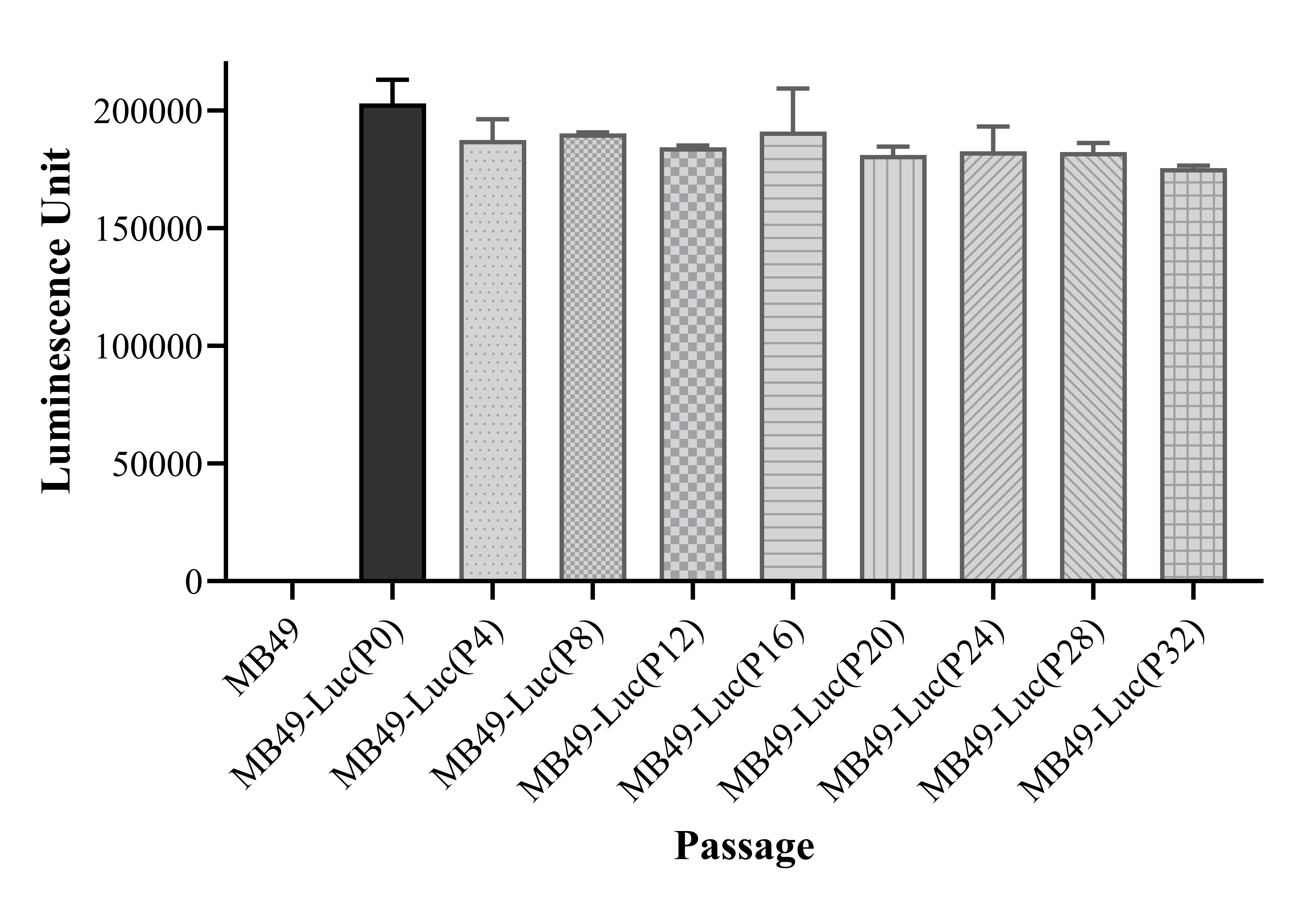 Figure 1. Stablity test results. MB49-Luc showed at least 32 passage stability with similar luminescence unit. |