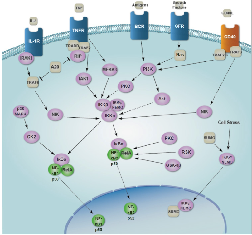 Description: pNFkB-Luc is designed for monitoring the activation of the nuclear factor of kappa light polypeptide gene enhancer in B-cells (NFkB) signal transduction pathway. NFKB is a transcription regulator that is activated by various intra- and extra-cellular stimuli such as cytokines, oxidant-free radicals, ultraviolet irradiation, and bacterial or viral products. Activated NFKB translocates into the nucleus and stimulates the expression of genes involved in a wide variety of biological functions.
