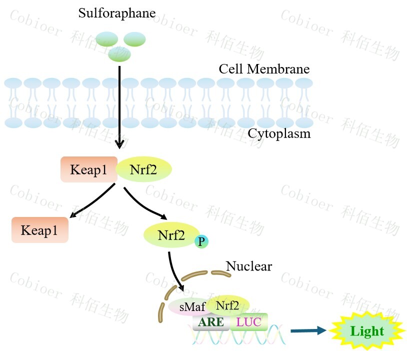 ARE-Luc(Nrf2 Antioxidant Pathway) HEK293 報告基因細胞,是由 ARE 調(diào)控并表達 Luc 熒光素酶報告基因的 HEK293 細胞。Sulforaphane 是 Keap1/Nrf2/ARE 的誘 導劑,原理見下圖所示。![]() Figure 1. ARE-Luc(Nrf2 Antioxidant Pathway) HEK293 細胞模型原理圖