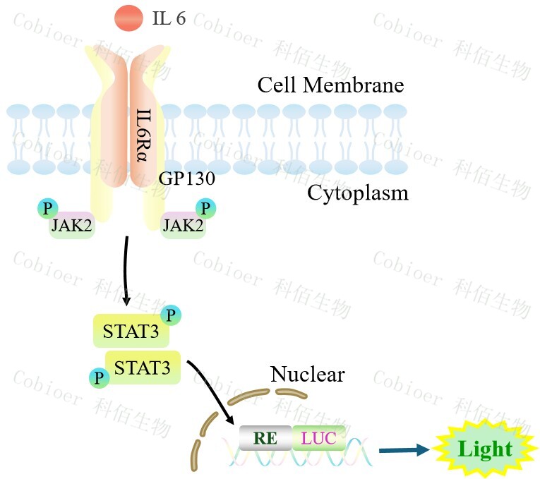 STAT3-Luc HEK293 報告基因細胞,是由 STAT3 調(diào)控并表達 Luc 熒光素 酶報告基因的 HEK293 細胞。IL6 細胞因子與受體復合物結合,啟動 JAK/STAT3 信號通路,原理見下圖所示。