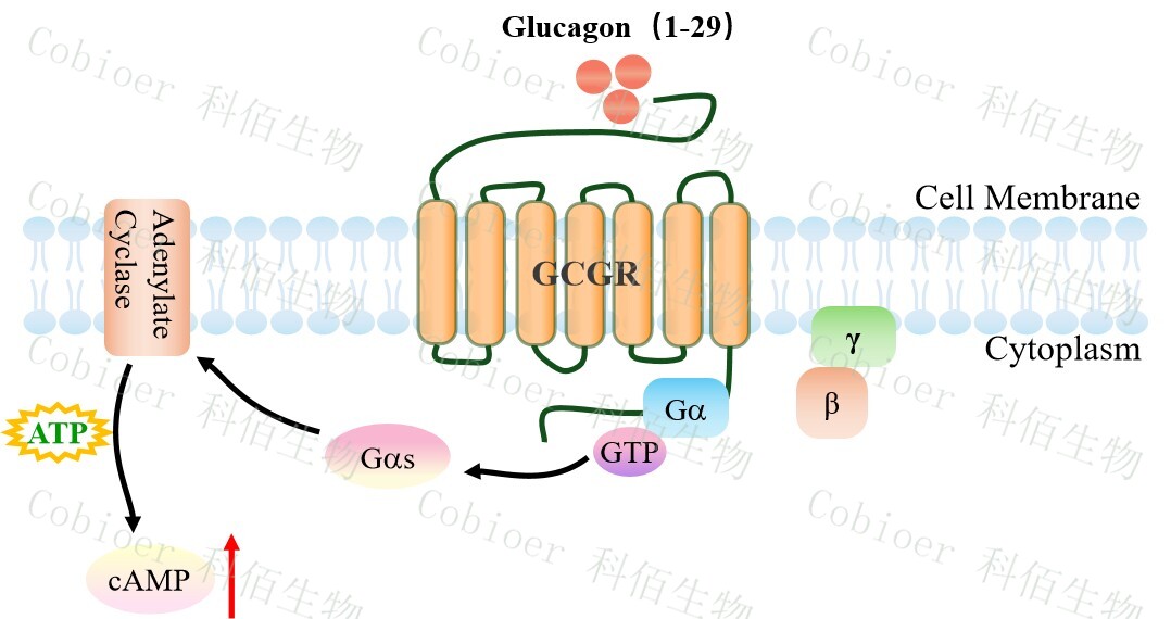 | 胰高血糖素是一種胰腺肽激素,作為胰島素的反調(diào)節(jié)激素,刺激葡萄糖通過(guò)肝臟釋放, 維持葡萄糖穩(wěn)態(tài)。GCGR 是一種 B 類(lèi) GPCR,最初被描述為與腺苷酸環(huán)化酶功能相連的胰 高血糖素結(jié)合體。它在維持葡萄糖穩(wěn)態(tài)中起關(guān)鍵作用,因此被認(rèn)為是治療糖尿病的一個(gè)有 價(jià)值的靶點(diǎn)。 GCGR 的天然配體是胰高血糖素。胰高血糖素與受體結(jié)合激活 Gs 蛋白,從而激活腺苷 酸環(huán)化酶。GCGR 受體與天然配體胰高血糖素結(jié)合調(diào)節(jié)體內(nèi)葡萄糖穩(wěn)態(tài),是Ⅱ型糖尿病的 重要藥物靶點(diǎn)。 |