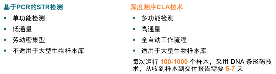 下表比較了用于細(xì)胞系認(rèn)證的深度測序CLA和基于PCR的STR檢測: