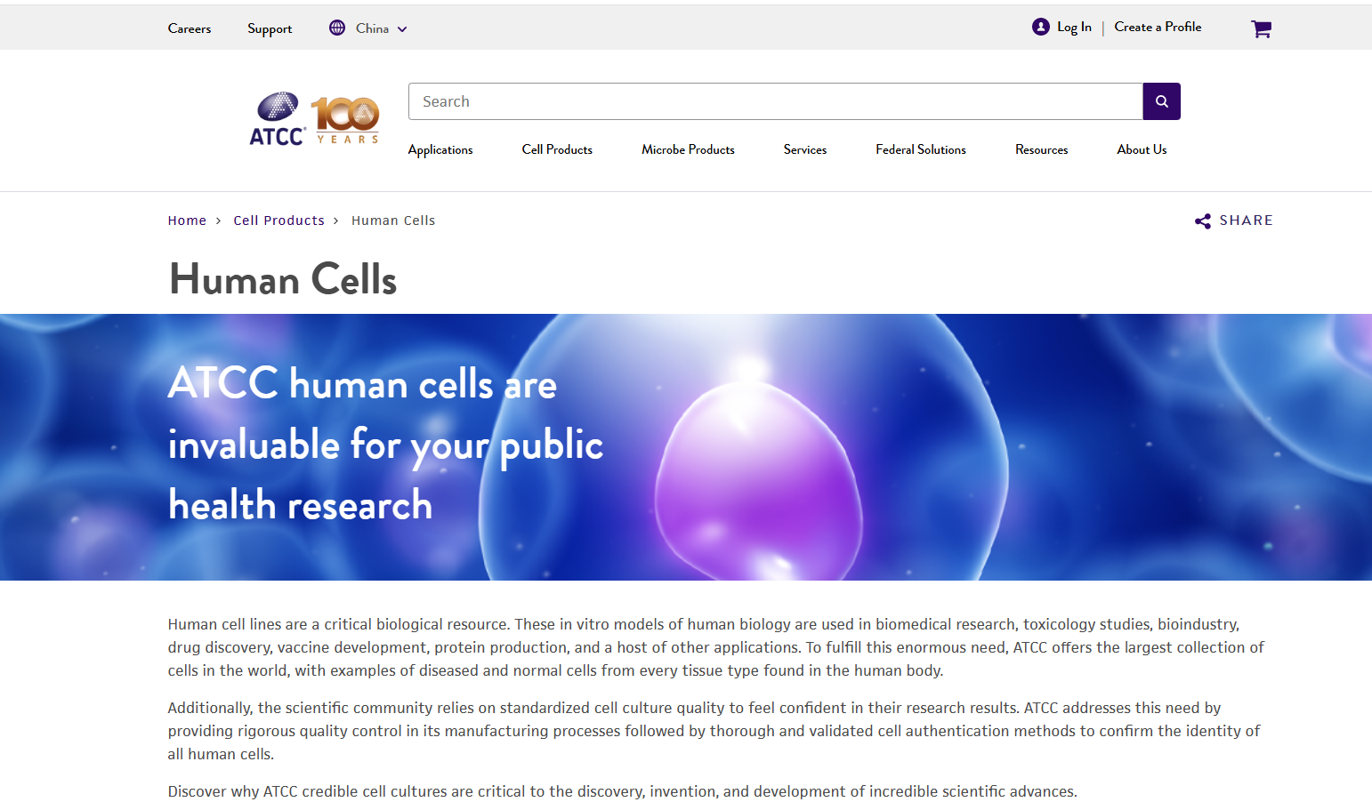 ATCC (American Type Culture Collection) 非營(yíng)利性的全球生物資源中心和標(biāo)準(zhǔn)組織,也是認(rèn)證細(xì)胞系和微生物的領(lǐng)先開(kāi)發(fā)商和供應(yīng)商,擁有世界上最大、最廣泛的人類和動(dòng)物研究細(xì)胞系產(chǎn)品目錄,主要提供各種細(xì)胞系、微生物株、原代細(xì)胞、基因組和其他生物材料。它包含了數(shù)千種細(xì)胞系,包括人類、動(dòng)物和昆蟲(chóng)的細(xì)胞系。常見(jiàn)的類型包括癌癥細(xì)胞系、免疫細(xì)胞、干細(xì)胞、以及轉(zhuǎn)基因細(xì)胞系。且細(xì)胞系數(shù)據(jù)中包含了詳細(xì)的細(xì)胞表征信息,如形態(tài)學(xué)、分子標(biāo)記、基因表達(dá)譜、增殖能力、傳代歷史等。它所提供的細(xì)胞形態(tài)圖是國(guó)際公認(rèn)的細(xì)胞標(biāo)準(zhǔn),大多數(shù)研究學(xué)者在購(gòu)買(mǎi)細(xì)胞后都會(huì)與ATCC數(shù)據(jù)庫(kù)中的細(xì)胞圖片作對(duì)照。