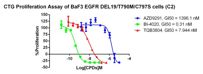 我們結(jié)合自己多年在細(xì)胞領(lǐng)域的豐富經(jīng)驗(yàn),在 Ba/F3(小鼠原B細(xì)胞)上進(jìn)行改造,引入相應(yīng)表達(dá)激酶基因,這些基因能作為Ba/F3的驅(qū)動(dòng)基因,讓Ba/F3不再依賴IL-3而增殖,進(jìn)而激酶基因成為Ba/F3增殖依賴的驅(qū)動(dòng)基因,用于評(píng)估小分子藥物對(duì)激酶的靶向抑制作用。