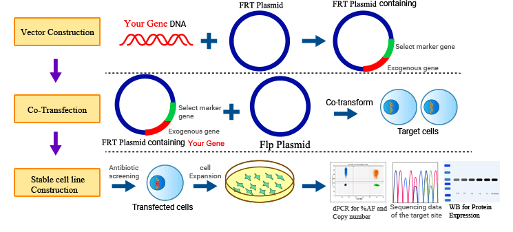 Flp-FRT整合系統(tǒng)是一種用于構建穩(wěn)定細胞系的方法,該細胞系可在宿主細胞基因組的特定位置表達目的基因。該系統(tǒng)利用 Flp 重組酶和 FRT(Flp 重組靶位)位點實現(xiàn)位點特異性重組和整合。該系統(tǒng)可實現(xiàn)目的基因的穩(wěn)定表達,確保細胞中蛋白質的持續(xù)生產(chǎn)。
