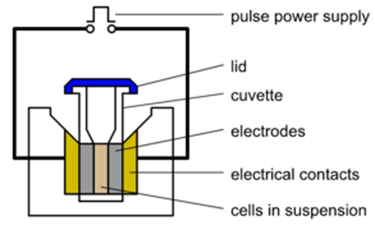 體外電穿孔時,將靶細胞懸浮液與待導入細胞的質粒DNA在導電溶液中混合,然后放入比色皿中(圖1)。電穿孔比色皿的樣品室兩側各有一塊金屬板,電流可以通過混合物。將比色皿放入電穿孔儀的腔室中,該腔室配有相應的電觸點,使比色皿形成電路。電穿孔儀上的控制器允許用戶設置待輸送電脈沖的電壓、波形和持續(xù)時間,這些參數(shù)應根據(jù)靶細胞類型進行優(yōu)化。然后,電脈沖通過樣品室。