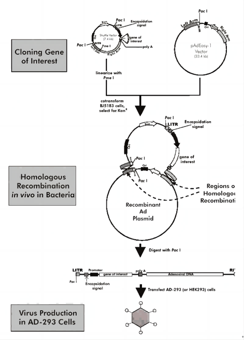 AdEasy包裝系統(tǒng)主要的特點(diǎn)是利用Cre/loxP系統(tǒng)在大腸桿菌(BJ5183)中完成外源基因插入腺病毒基因組的過程,獲得環(huán)狀的重組腺病毒基因組,并且具有在細(xì)菌中復(fù)制的必需元件。將重組腺病毒基因組酶切線性化后轉(zhuǎn)染HEK293細(xì)胞,避免了雙質(zhì)粒共轉(zhuǎn)染得到重組腺病毒。