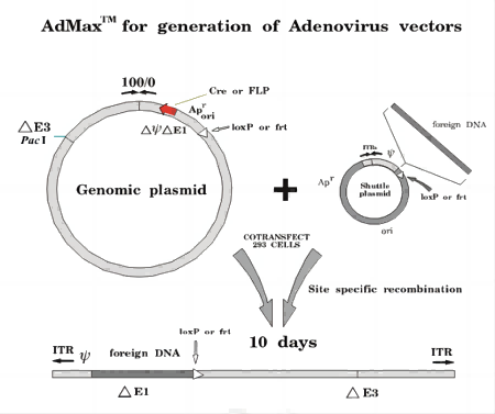 AdMax包裝系統(tǒng)是通過Cre/loxP 獲得重組病毒,這個過程發(fā)生在HEK293細(xì)胞中,從而避免在細(xì)菌中重組。將克隆了外源基因的腺病毒穿梭質(zhì)粒與攜帶了腺病毒大部分基因組的包裝質(zhì)粒共轉(zhuǎn)染HEK293細(xì)胞,利用Cre/loxP系統(tǒng)的作用實(shí)現(xiàn)重組,產(chǎn)生重組腺病毒。這個系統(tǒng)有多種優(yōu)勢,包括操作簡便、重組效率高、獲得的病毒產(chǎn)率高、目的基因的表達(dá)水平高(因?yàn)閙CMV啟動子比hCMV啟動子強(qiáng)若干倍)等。