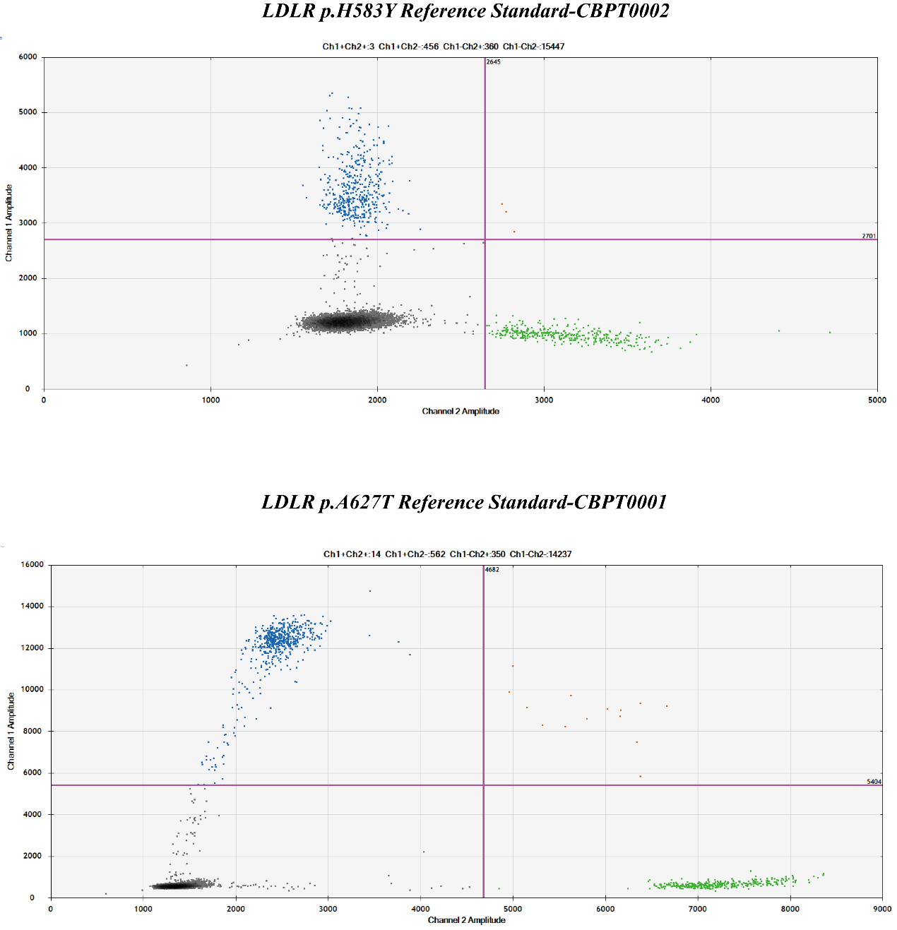 Fig 1. Results of dPCR with LDLR p.H583Y Reference Standard and LDLR p.A627T Reference Standard.
