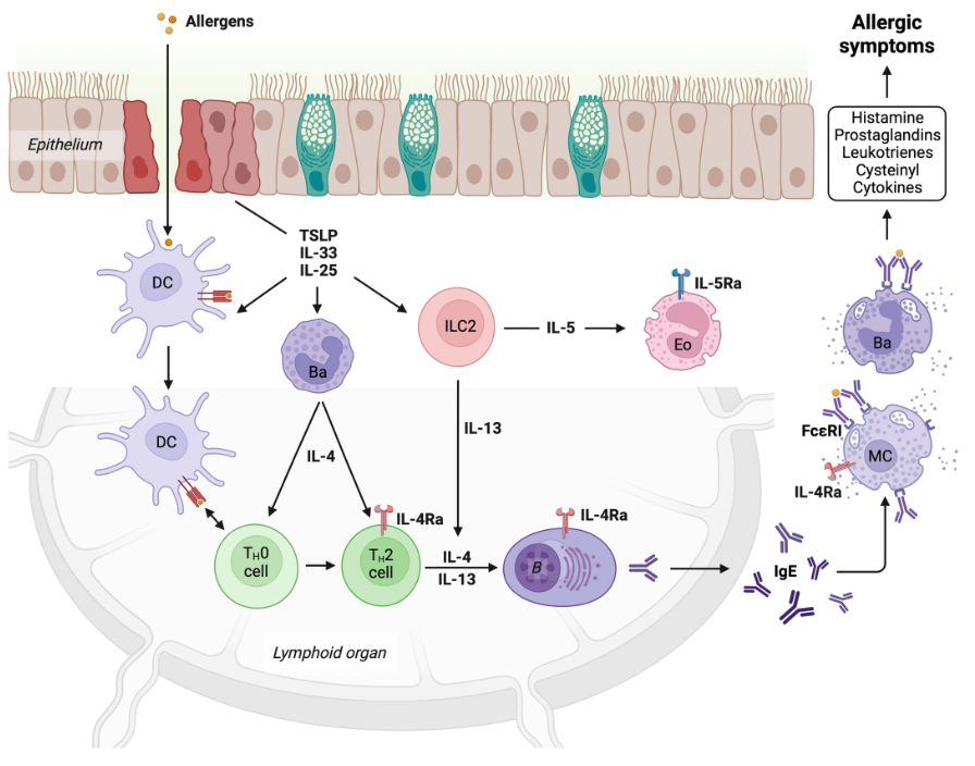過敏的病因與Ⅱ型炎癥反應(yīng)密切相關(guān),會導(dǎo)致過敏原特異性免疫球蛋白E(IgE)的產(chǎn)生,這是許多過敏性疾病的關(guān)鍵驅(qū)動因素。在高水平上,初始的過敏原暴露會破壞上皮的完整性,通過包括IL-25、IL-33和TSLP在內(nèi)的細胞因子觸發(fā)局部炎癥,這些炎癥激活Ⅱ型先天淋巴樣細胞以及其他免疫細胞來分泌Ⅱ型細胞因子IL-4、IL-5和IL-13,促進Th2細胞的發(fā)育和嗜酸性粒細胞的招募。Th2細胞依賴的B細胞激活促進了過敏原特異性IgE的產(chǎn)生,IgE穩(wěn)定地與嗜堿性細胞和肥大細胞表面的Fc段含高親和力受體(FcεRI)結(jié)合。在過敏原再次暴露后,這些細胞迅速脫粒導(dǎo)致過敏癥狀。