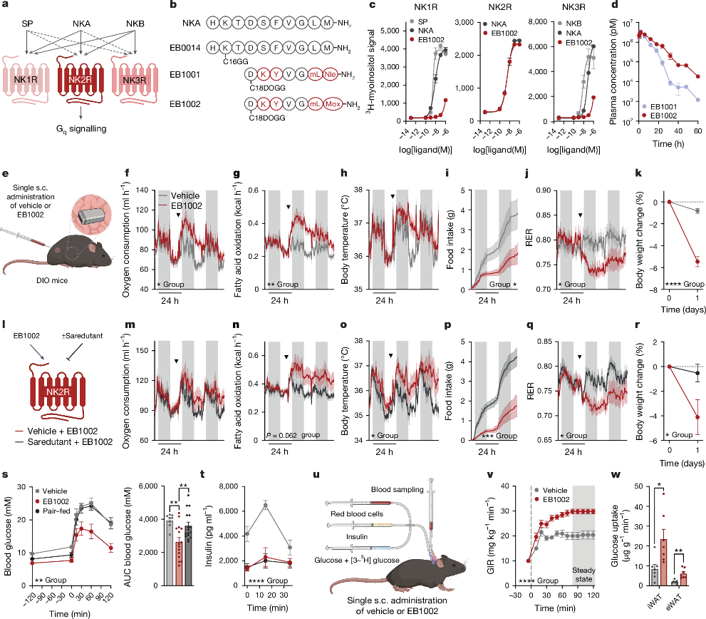 在文章研究部分,科研人員對肥胖模型小鼠注射了一種NK2R的天然配體激動劑后發(fā)現(xiàn)這些肥胖小鼠體重在短期明顯下降,分析結果表明小鼠的能量消耗顯著增加,食物攝入下降約20%,且該代謝效應并不依賴于瘦素(Leptin)信號通路。此外,科研人員發(fā)現(xiàn)優(yōu)化后的NK2R激動劑EB1002不僅使小鼠在單次注射后的7天內(nèi)體重持續(xù)下降約15%,還能提高小鼠對胰島素的敏感性,促進白色脂肪組織攝取葡萄糖,且能激活下丘腦弓狀核和室旁核神經(jīng)元來抑制因瘦素或黑皮質素4受體缺失引起的高食欲狀態(tài)。這個結果表明該靶點可能在抗肥胖領域中,遠比合并糖尿病的肥胖具有更廣泛的應用前景。