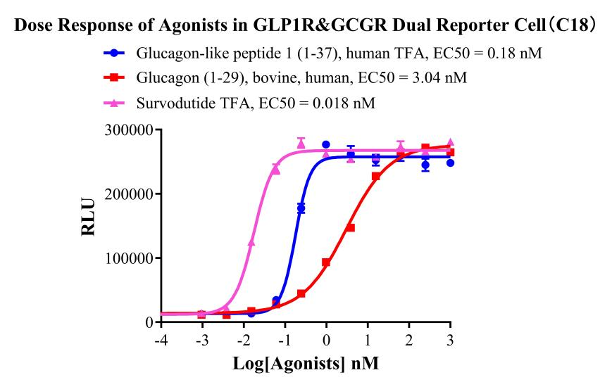 為助力靶點(diǎn)藥物研發(fā),南京科佰開發(fā)了GLP1R&GCGR Dual Reporter Cell和GLP1R&GIPR Dual Reporter Cell細(xì)胞篩選模型,產(chǎn)品驗(yàn)證結(jié)果如下: