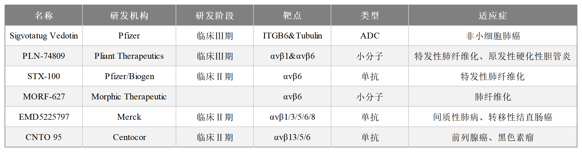 2025年JPM大會上,Pfizer 公布其Sigvotatug Vedotin(SGN-B6A)在非小細(xì)胞肺癌患者中良好的抗腫瘤活性和初步的療效,特別是在未接受過紫杉烷治療的非鱗狀NSCLC患者中,其療效更為顯著。整合素αvβ6作為纖維化和腫瘤治療的潛力靶點,近年來藥物研發(fā)進(jìn)展迅速,涵蓋單抗、小分子、ADC及基因療法等領(lǐng)域。