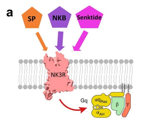 速激肽是在整個神經(jīng)和免疫系統(tǒng)中表達的神經(jīng)肽,作為興奮性神經(jīng)遞質(zhì),它們在調(diào)節(jié)各種生理功能中很重要。在不同的速激肽中,P物質(zhì)(SP)、神經(jīng)激肽A(NKA) 和NKB已得到充分研究。這些肽可以通過三種不同的G蛋白偶聯(lián)受體(GPCR)、神經(jīng)激肽1受體 (NK1R)、神經(jīng)激肽2受體(NK2R)和NK3R發(fā)揮作用,作為具有不同親和力的完全激動劑。NKB、SP和NKA是10-11個氨基酸的線性肽,它們共享一個保守的C端基序-Phe-Xaa-Gly-Leu-Met-NH2,介導神經(jīng)激肽受體激活,而速激肽神經(jīng)肽的不同N末端與神經(jīng)激肽受體的優(yōu)先結(jié)合。NKB優(yōu)先激活與G蛋白Gαq偶聯(lián)的NK3R進行細胞內(nèi)信號轉(zhuǎn)導,而 SP和NKA分別優(yōu)先與NK1R和NK2R結(jié)合。SP還可以激活NK3R,但活性低于NKB 。SP 類似物Senktide是一種六肽,在6位有 Asp,在8位有甲基化Phe,N端受琥珀酸保護。此外,Senktide比內(nèi)源性配體NKB和SP更有效地激活 NK3R。