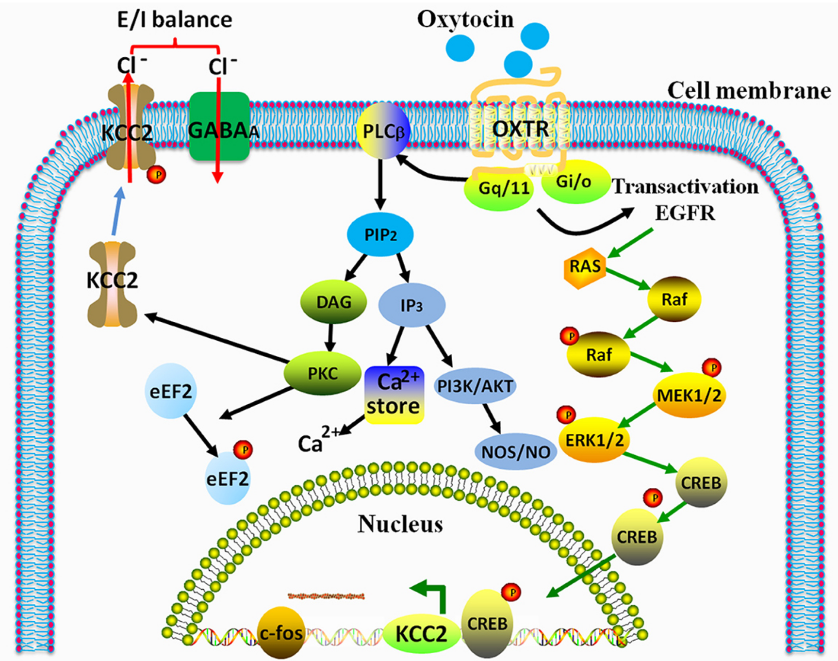 催產(chǎn)素(OXT)是大腦中由下丘腦室旁核(PVN)和視上核(SON)產(chǎn)生的神經(jīng)肽,主要作為外周系統(tǒng)中的激素,可促進(jìn)母乳喂養(yǎng)時(shí)的乳汁分泌,調(diào)節(jié)分娩時(shí)的子宮收縮,緩解疼痛和促進(jìn)分娩過程,促進(jìn)傷口愈合。此外,中樞神經(jīng)系統(tǒng)(CNS)中的 OXT 系統(tǒng)在社會認(rèn)可、社交行為、焦慮相關(guān)行為和自主神經(jīng)功能中起著重要作用,例如母體行為、攻擊性、交配、依戀和性行為。除了促社會效應(yīng)外,OXT 還被確定為大腦中重要的抗應(yīng)激和抗焦慮因子,通過其靶受體(催產(chǎn)素受體,OXTR)激活細(xì)胞內(nèi) MEK/ERK 信號傳導(dǎo)。