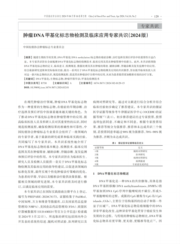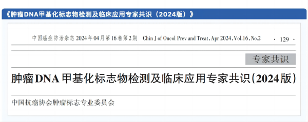 2024年4月,《腫瘤DNA甲基化標(biāo)志物檢測及臨床應(yīng)用專家共識》于中國癌癥防治雜志重磅發(fā)布。