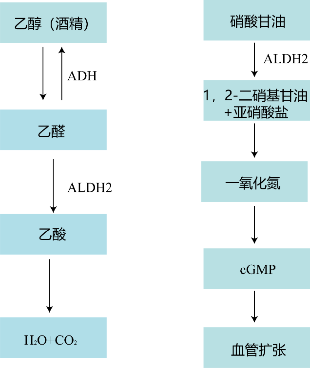 ALDH2(acetaldehyde dehydrogenase 2),線粒體乙醛脫氫酶2,位于第12號染色體的12q24.2位置,全長43,438bp,共有15個外顯子,編碼由517個氨基酸殘基組成的蛋白質(zhì)。ALDH2是人體催化硝酸甘油生物轉(zhuǎn)化的主要途徑,該酶同時具有脫氫酶和酯酶的催化活性,其酯酶活性可以通過將硝酸甘油脫硝產(chǎn)生NO,進(jìn)而引起血管擴(kuò)張。