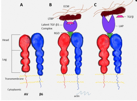 整合素αvβ6特異的配體主要配體包括細胞外基質(zhì)蛋白如纖維連接蛋白(Fibronectin)、層粘連蛋白(Laminin)以及潛活形式的TGF-β。潛伏期相關(guān)肽(LAP)是轉(zhuǎn)化生長因子β(TGF-β)前體肽的氨基末端結(jié)構(gòu)域,形成潛在的 TGF-β 復(fù)合物,并充當(dāng)整合素 αvβ6 的配體。當(dāng)整合素 αvβ6 通過LAP與細胞外位點的潛在TGF-β復(fù)合物結(jié)合時,同時與細胞內(nèi)細胞骨架結(jié)合時,活性TGF-β從潛在復(fù)合物中釋放出來,驅(qū)動纖維化和免疫抑制微環(huán)境形成;此外,αvβ6還可作為口蹄疫病毒(FMDV)等病原體的入侵受體。